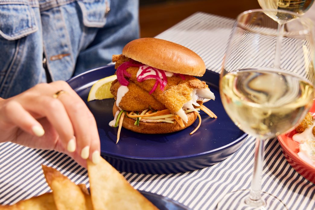 Each burger is built on a lightly toasted bun, stacked with crisp veggie ribbons, zingy sauce, and your choice of perfectly cooked seafood:
