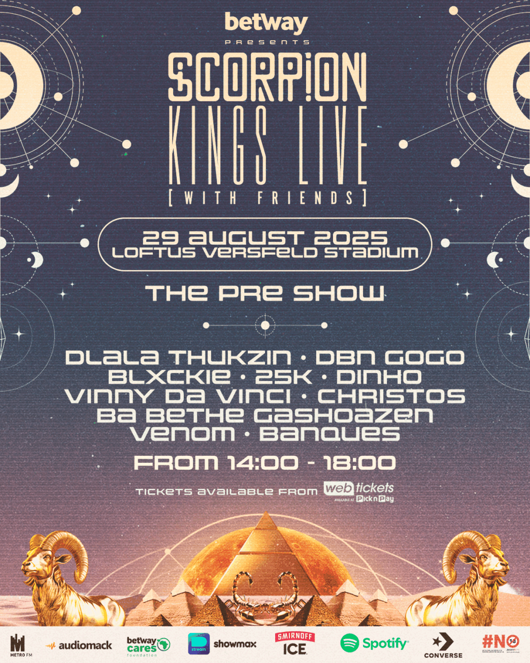 The pre-show stage will showcase a handpicked selection of artists who represent South Africa’s music scene. Expect explosive performances from DBN Gogo, Blxckie, 25K, Venom, Dlala Thukzin, Dinho, Christos, Vinny Da Vinci, Ba Bethe Gashoazen and Banques – all geared to ignite the crowd and build the energy for Betway Presents Scorpion Kings Live with Friends.