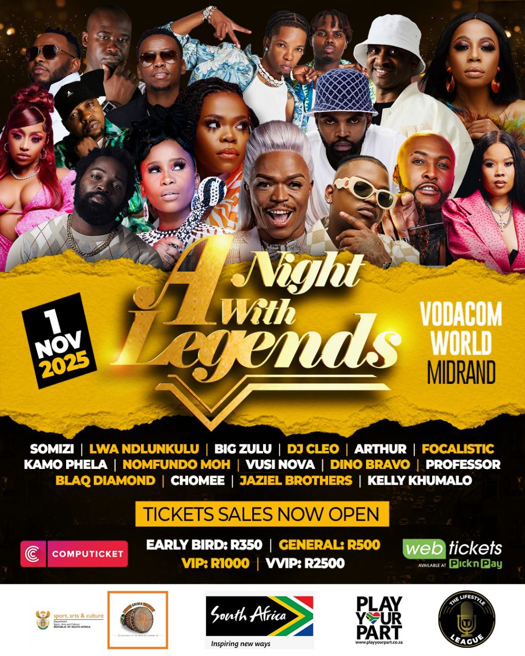 A Night With Legends 2025, proudly sponsored by the Department of Sport, Arts and Culture (DSAC)through the Mzansi Golden Economy (MGE) Programme, will take place on 1 November 2025 at Vodacom World, Midrand.