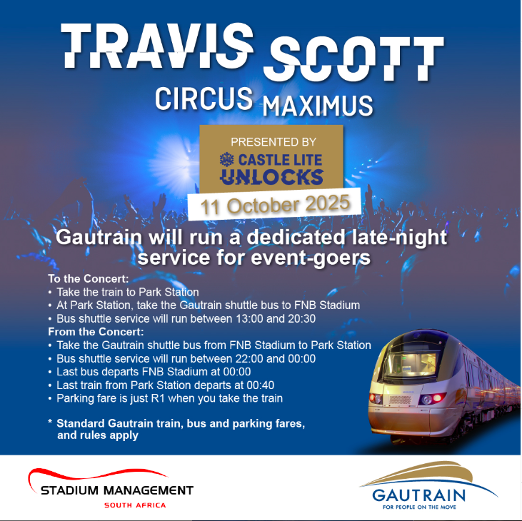 “We understand that for many concertgoers, the experience begins well before the performers take the stage,” says Tshepo Kgobe, CEO of the Gautrain Management Agency. “That’s why we’re ready to welcome thousands of fans and provide a smooth, reliable journey to and from the stadium. This way, they can focus on what matters most, that is to enjoy the moment.”